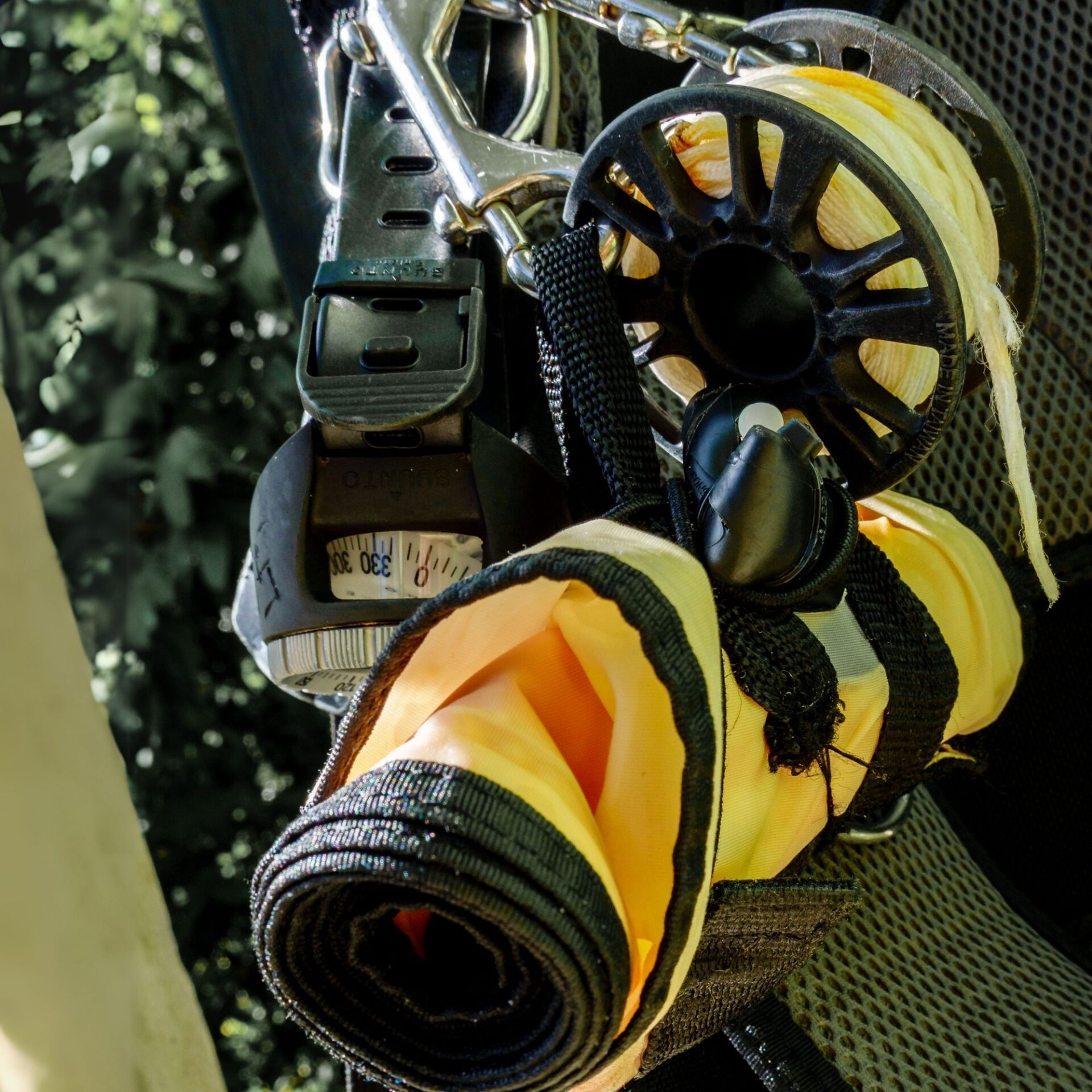 Safety Equipment: Surface marker buoy (SMB), cutting tool, dive light